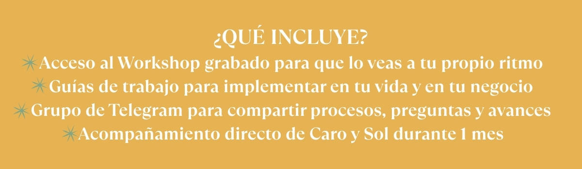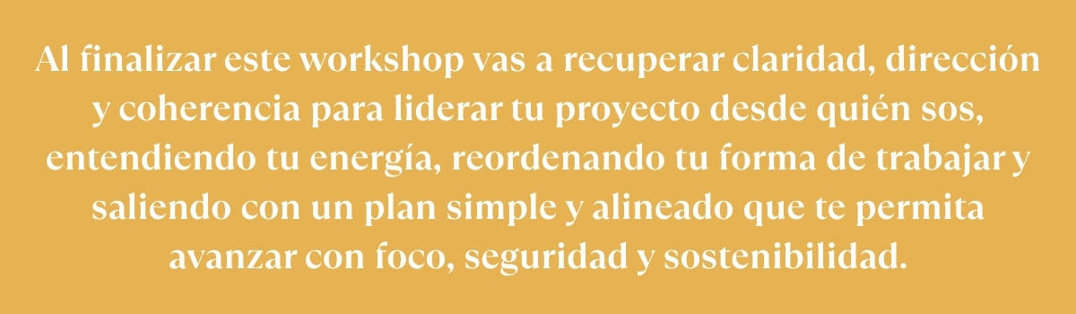 Un Workshop para dueñas de negocios y emprendedoras, que hoy se sienten desconectadas, abrumadas o sin claridad sobre el rumbo de su proyecto. Y necesitan recuperar dirección y foco para rediseñar su negocio en sintonía con su forma real de vivir y liderar.